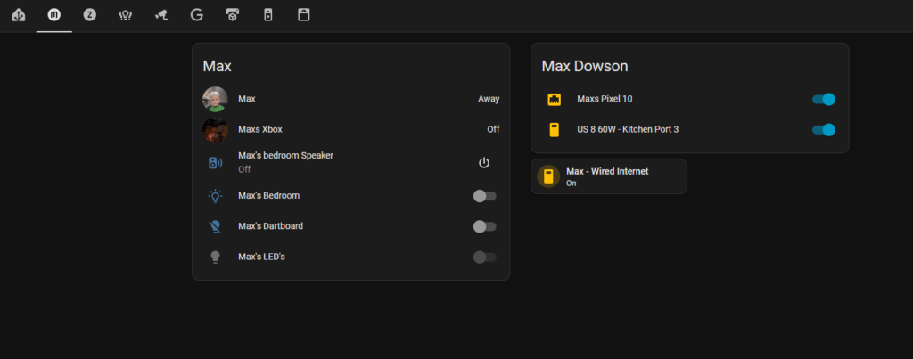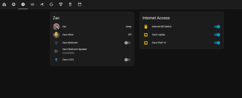 Maxs page shows me if hes home first of all, this is determined by whether his phone is connected to the network, I can see his Xbox status, lights and that sort of thing. And something I’ve been working on for both of them is an internet kill switch (So that I can make them do their chores)
