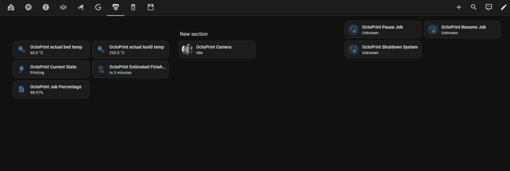 The octoprint stuff is pretty much out of the box entity cards, showing current status and that sort of thing as well as a thumbnail for the webcam.
